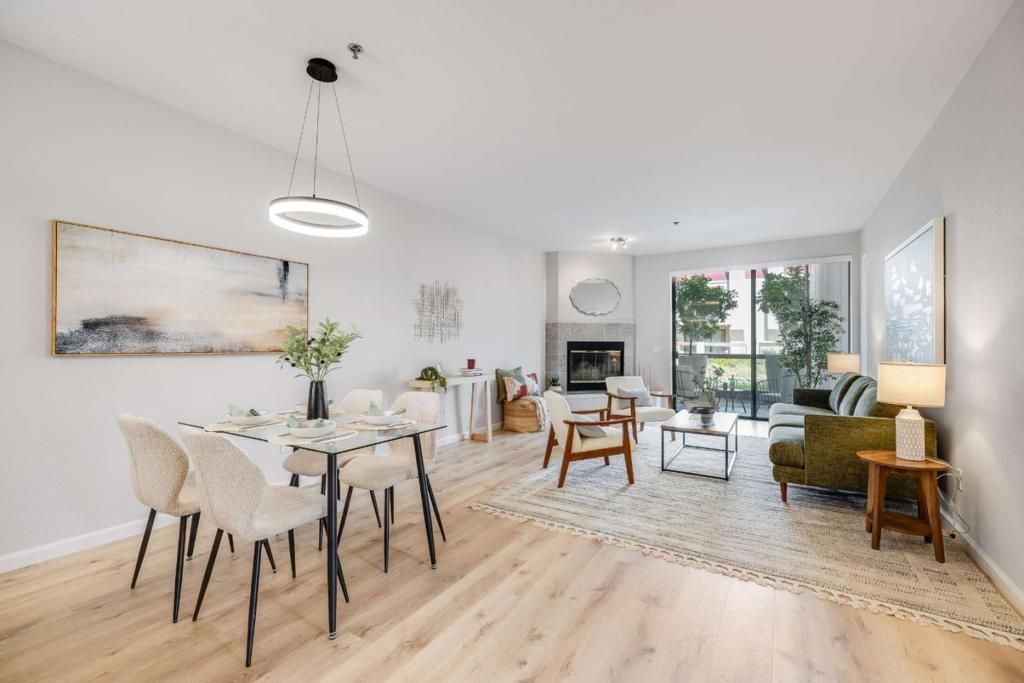 Step inside and you immediately feel it: bright, calm, and turnkey luxury. Fresh new paint on the walls and ceilings, crisp white baseboards and trim, updated lighting, and light natural-oak waterproof Pergo+ flooring create a clean, modern look throughout. The open living and dining area is anchored by a cozy fireplace and a wall of glass that pulls the outdoors in, making the space feel airy, relaxed, and easy for hosting or unwinding. The kitchen is refreshed with new stone countertops and a bright, open layout that stays connected to the living space. The bathroom is a standout with a window for natural light and a water glimpse, plus large vanity, great storage, and a glass-enclosed shower wrapped in stone tile to the ceiling. The bedroom is finished with plush new Berber carpet for added comfort and warmth. As a corner unit, this home offers extra privacy and natural light, brand new vertical and horizontal blinds plus the wide water view becomes your daily reset and the patio quickly becomes your favorite space. You also get full-size in-unit laundry, two large personal storage rooms for real-life gear, and two parking spaces (one covered). Set in a community with two pools and waterfront surroundings, this home leaves nothing to compromise and everything to enjoy.