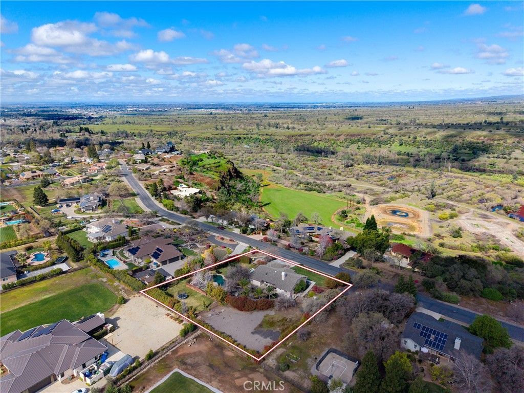 Welcome to your private retreat in the highly desirable Rocky Bluffs community ? just minutes from Chico, yet offering the serenity of sweeping canyon views and the security of a gated entry. The impeccably maintained grounds are designed for both relaxation and entertainment. Enjoy a stunning Bob Hill Pebble-Tec pool complete with beach entry and slide, multiple lush grass areas, a large covered patio, a dedicated play area, ample off-street parking, and multiple terraced seating areas perfectly positioned to take in the breathtaking views. Inside, this spacious home offers four bedrooms PLUS a private office. The open-concept living area flows seamlessly into an eat-in dining nook and formal dining room, providing versatile spaces for everyday living and special gatherings. Northern California Walnut floors throughout and brand new carpet in the bedrooms. The kitchen is thoughtfully designed with a center island, breakfast bar, built-in double oven, separate gas cooktop, and freshly painted white cabinetry. The expansive primary suite is privately situated away from the other bedrooms and features a generous walk-in closet and a luxurious ensuite bath with dual sinks, a soaking tub, and separate shower. With its incredible location, privacy, and resort-style amenities, this Rocky Bluffs property truly has it all.