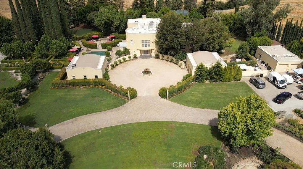 One-of-a-kind Palladian estate known as The Villago, set on nearly 10 acres with breathtaking views, unforgettable sunrises and sunsets, and over 200 owned solar panels (most of the panels are newer) for remarkable efficiency. Built in 1988, this extraordinary 6,424+/- sq. ft. multi-level home offers 5 bedrooms and 5 bathrooms surrounded by thoughtfully updated HVAC, mini splits, electrical, irrigation, updated French drains, and ponds. The grounds feature leveled brick paths, scenic trails, mature trees, two ponds with fountains, and a private tennis court with LED lighting. EV charging capability in the garages plus a 50-amp RV hookup. Updated circuit board and pump equipment the septic and well also serves a great cost-effective home. The grand entry draws you into a stunning living space framed by floor-to-ceiling views of nature and multiple French doors opening to the exterior grounds. An elegant oval dining room with private doors creates the perfect setting for intimate dinners or meetings. The kitchen showcases panoramic views of the pool and landscape, a cozy breakfast nook, and ideal flow for hosting. Multiple flexible spaces throughout the home offer options for offices, gatherings, or quiet retreats, plus an impressive laundry room. Just upstairs, the oversized primary suite is a sanctuary with exterior access, heated floors, floor-to-ceiling windows, a jaw-dropping closet, spa-like bathroom with soaking tub, walk-in shower, extended vanity, and abundant storage. Additional upper levels include a library/office that can convert to a bedroom, loft-style spaces overlooking the grand living room, private bedroom suites with their own bathrooms, and a unique observatory-style sitting area to take in the views. Entertain in style with sitting area including outdoor speakers throughout the property, a temperature-controlled wine cellar and tasting room adorned with custom murals. Outdoors, enjoy the pool with outdoor shower and a detached guest quarters offering TWO private bedroom suites beside the pool. Two detached 4-car garage buildings with climate-control mini splits provide incredible versatility for hobbies, business, media, or storage. Fire department quick hookup available by the pond. A rare estate where architecture, nature, privacy, and functionality come together in a truly unforgettable setting. Bedroom count and sq ft may reflect differently on tax records. Buyer to verify all information to their satisfaction.