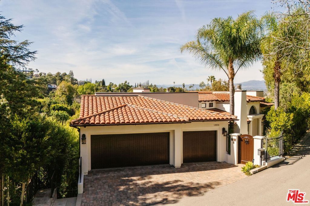 Welcome to 13551 Cheltenham Drive. Inspired by a refined Ojai Spanish aesthetic, this custom-built 2003 residence blends timeless elegance with white stucco walls, a red-clay tile roof, wrought-iron detailing, and graceful arched doorways, all bathed in extraordinary natural light. Spanning 3,582 square feet, the 4-bedroom, 4-bath home also offers approximately 700 square feet of additional storage and an expansive three-car garage with direct access, set against sweeping valley views with exceptional privacy. An immediate sense of calm greets you upon entering the grand great room, where soaring ceilings, exposed wood beams, and an open-concept design seamlessly connect the living spaces. The thoughtfully updated kitchen flows effortlessly into the dining area and a charming library nook, creating an inviting atmosphere for both everyday living and entertaining. Recent kitchen and bathroom renovations introduce refined finishes throughout, highlighted by a brand-new primary bathroom suite and an exceptional walk-in closet designed as a true retreat. Indoor-outdoor living unfolds with ease, as patios open to serene outdoor spaces complete with a hot tub and sauna perfect for relaxing while taking in the tranquil surroundings. A rare offering that artfully combines architectural character, modern enhancements, breathtaking views, and complete privacy in the heart of Sherman Oaks.