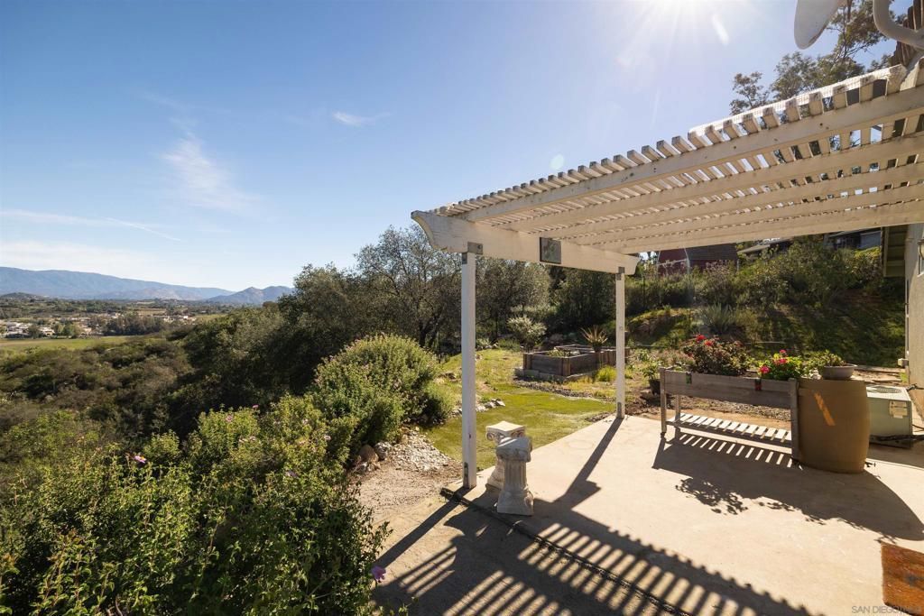 Those of you that like privacy, open space and whopping panoramic views yet need to get your Powerball lottery ticket, it all works in your favor. Elegantly situated on a level site with gentle sloping area. Situated on the border of Valley Center and Escondido for convenience. Very open with sun-filling, rooms capture energy while doing your living experiences in this spacious single-story home. Combined soft carpeting and tile throughout. Kitchen is open for family appeal using expansive countertops with traditional beige tiles including newly renovated grouting. Energy efficient appliances support savings. Lets approach security with a camouflaged black coated chain-link fence that surrounds the entire property. As you enter you go through an elegant electric gate welcoming you in. A very enjoyable and relaxing courtyard patio in front floating above and viewing Mt. San Jacinto Palomar Mountain and heavenly skies. A wood burning fireplace for cool nights and a trickling fountain relaxing your tension. Well done with rumble stone foot wall engulfing the whole patio. Parking Areas accommodate remote control car racing, dinner parties, hopscotch, you name it.