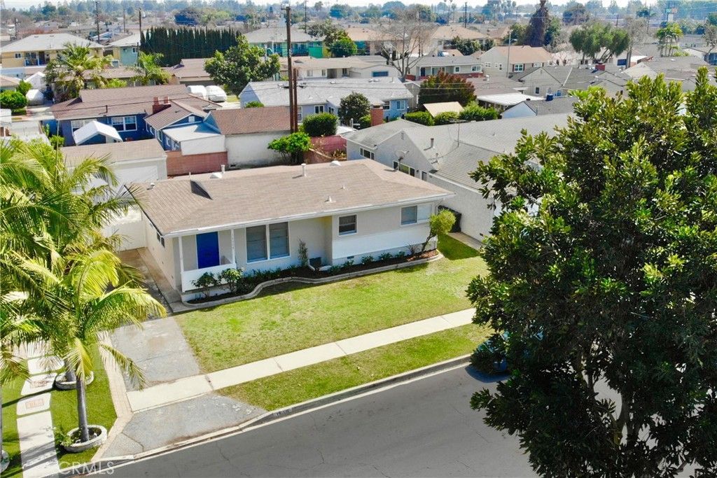 1953 mid-century era ? Single-story ranch ? North Bellflower near Downey border ? Expanded open dining layout ? Large fenced yard ? Detached 2-car garage ? ADU potential. Built in 1953, this single-story home offers classic mid-century era ranch construction with refinished original hardwood floors and a practical open layout. Recent updates include full interior and exterior repaint, sanded and varnished hardwood flooring, new porcelain kitchen sink, updated cabinet hardware and drawer pulls, reglazed tub and vanity, new ceiling fans, and new window coverings. The kitchen opens to an expanded dining area created from the original third bedroom, providing flexible open-concept living with sliding glass doors leading to the backyard. Interior laundry is located on the service porch with washer and dryer hookups available for both gas and electric. The fully fenced backyard includes a large covered back porch and substantial open space suitable for outdoor use, future expansion, or potential accessory dwelling unit (ADU) development (buyer to verify with city). Detached two-car garage at the rear features a newer roll-up aluminum door. Roof replaced approximately 15 years ago. Public record reflects original 3-bedroom configuration. Positioned in north Bellflower near the Downey border within the Downey Unified School District boundaries. Located near Simms Park, St. John Bosco High School, Kaiser Permanente Downey Medical Center, and The Promenade at Downey shopping and dining destination. Area access includes the San Gabriel River regional bike trail and convenient connections to the 91, 605, and 105 freeways.