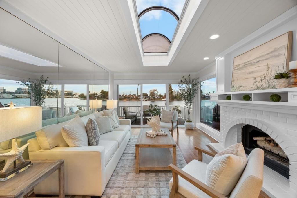 Warm, refined, and effortlessly elegant, this single level 2 bed, 2 bath waterfront home offers an unbeatable lifestyle. Rich hardwood flooring flows throughout, setting a welcoming tone and enhancing the homes timeless appeal. The galley style kitchen features high end name brand appliances, cherry cabinetry, and a Sub-Zero refrigerator, opening naturally to the living space. Wainscoting adds subtle architectural detail, while skylights bathe the home in natural light, creating an airy, serene atmosphere. The living room, centered around a fireplace, opens directly to the rear deck, where expansive water views become the backdrop for daily life and evening gatherings. A separate dining area provides an intimate setting for hosting and special occasions. The primary suite, featuring two closets, an en-suite, and direct access to the deck overlooking the water. A second bedroom and full bath offer comfort and flexibility for guests or a home office. A warm, inviting color palette throughout enhances the sense of calm and comfort. Step outside to the rear deck and private dock, where sunsets, quiet mornings, and alfresco dining feel like a daily indulgence. A spacious two car garage with epoxy floors completes the home.