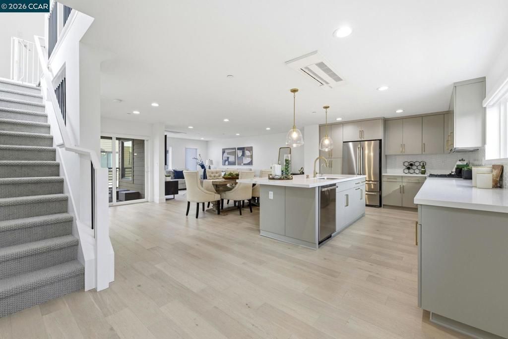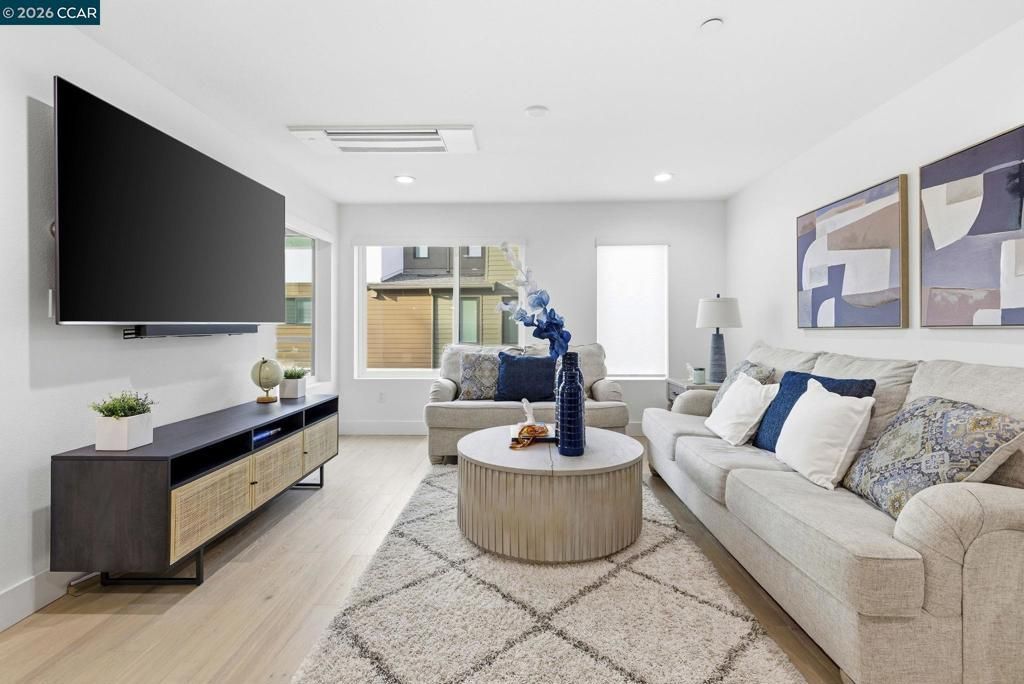 Built in 2021, this townhouse-style condo offers energy-efficient living with owned solar, full bedroom suite on the main level & walkability to BART, shopping, dining & Larkey Park. The main living areas are open & light-filled, featuring wide-plank flooring, recessed lighting & expansive windows that create a bright, modern feel. The chefs kitchen anchors the space with sleek slab cabinetry, brushed brass hardware, quartz counters & geometric tile backsplash. A generous island offers seating & prep space, complemented by stainless steel appliances & a 36-inch Bertazzoni gas range. The kitchen flows seamlessly into the dining & living areas, creating an ideal open-concept great-room layout for entertaining. A covered balcony extends the living space outdoors. Upstairs, the primary suite offers a serene retreat with oversized windows & spa-inspired bath featuring dual sinks, quartz counters, brass fixtures & glass-enclosed shower with designer tile. The 3rd bedroom is bright & versatile, also complete with its own beautifully appointed full bath. All bedrooms are ensuite, complemented by an attached two-car garage with EV charger. Served by top rated schools & quick access to major freeways & transit corridors. Designed for low-maintenance, modern living.