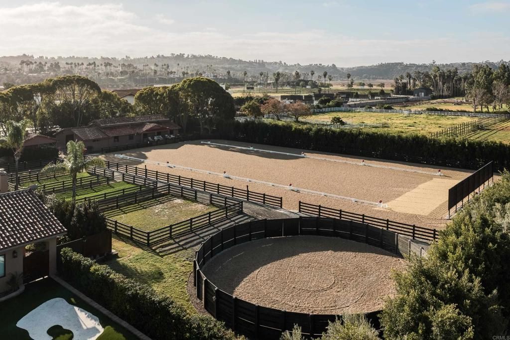 Masterfully crafted with intention and thoughtful design, this exceptional gated Rancho Santa Fe estate offers a premier setting for both elite riders and luxury living. Designed to support top competitive horses year-round, the professional equestrian facilities feature premium ebb-and-flow footing for optimal performance and conditioning in every season. The barn includes 8 stalls with the option to expand to 10, complemented by four lush grass pastures, a round pen, and a full-size dressage court with perimeter track and a dedicated arena viewing deck. Additional equestrian amenities include grooms quarters, a hay barn, and a state-of-the-art well system supplying the home, horses, and irrigation, complete with a water filtration system and a 3,750 gallon storage tank for added efficiency and reliability. The main residence blends comfort and sophistication, offering dual primary suites, four bedrooms total, and two private offices, ideal for work-from-home flexibility or estate management. A separate guest home provides complete independence with a full kitchen, living area, and two bedrooms, perfect for extended family, trainers, or visitors. Resort-style grounds elevate the lifestyle experience with a modern pool and spa, centrally positioned to create a natural gathering space and indoor-outdoor focal point of the home. Designed for effortless entertaining, the space includes alfresco dining, a fully equipped outdoor BBQ area, and a built-in pizza oven. Additional amenities include a professional putting green with premium turf, a dedicated golf room featuring a top-of-the-line TrackMan simulator, an owned solar system for energy efficiency, EV charging stations, a four-car garage, and abundant additional parking.