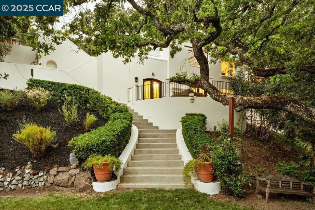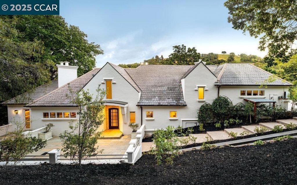 This Reliez Valley home is a private sanctuary. The main level offers formal spaces to the left and casual spaces to the right, linked by French oak hardwoods. The 384-sq-ft living room has a limestone fireplace. The dining room alongside welcomes 10-12 guests under elevated ceilings. The spacious family room also has a soaring ceiling. Nearby, a breakfast nook provides garden and pool views. Between sits the kitchen, with elite appliances, countertops, an island and bar seating. For entertainment, the home offers an 85 TV and sound system, and a spectacular 400-sq-ft cinema. A large office on the main level makes work from home easy. The 5 bedrooms are on the lower level, ensuring privacy. The principal suite is a serene haven with a custom fireplace, garden views, deck access, walk-in closet, and a spa-like bath. A second principal suite has its own en-suite bath, closet with built-in desk, and deck access. An au pair suite (now configured as a gym), with a separate entrance, completes the floor. The outdoor dining terrace seats 12-14 by a fireplace. Just steps below lie the lush lawn and heated pool and sun deck. A slate roof offers enhanced fire resistance. Although just 2 miles from Springhill Elementary and Acalanes High, the home feels a world apart, surrounded by nature.