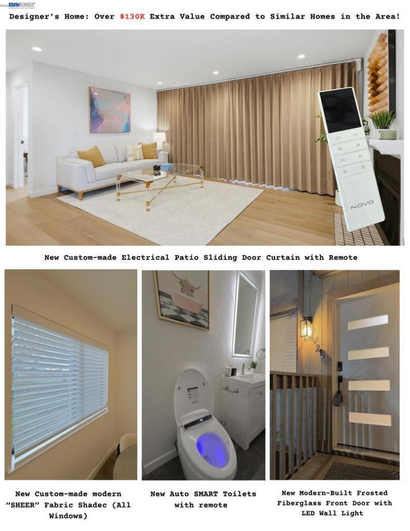 Huge Price Reduction!! Renovated Modern style, this home features a custom-made electric patio sliding door curtain with remote control & new custom-made modern sheer fabric shades on all windows. Modern kitchen showcases sleek cabinetry w/ LED light, quartz countertop, subway tile backsplash & GFCI outlets. Fully equipped w/ stainless steel sink, faucet, garbage disposal & stainless steel range hood. High-end appliances include a Samsung smart instant-heat induction slide-in range w/ oven, counter-depth refrigerator w/icemaker & water dispenser & smart dishwasher. Remodeled bathrooms offer auto open/close smart toilets /w remote, porcelain wall/floor tiles, vanities, sinks, faucets, LED mirrors, shower pans, tempered glass shower doors, rainfall shower system & modern ventilation fans w/ integrated light. Additional upgrades: GE washer/dryer laundry center, dimmer light switches, matte black door levers/hinges, smoke/carbon monoxide in all bedrooms. Waterproof floor w/ wall base molding trim throughout w/ Modern frosted fiberglass front door. Fresh primer/paint. 500-watt in-ceiling stereo system w/ subwoofer. 100-watt in-wall Bluetooth receiver w/ built-in amplifier. Fingerprint-enabled smart lock w/ remote access & Video intercom system /w doorbell camera &monitor.
