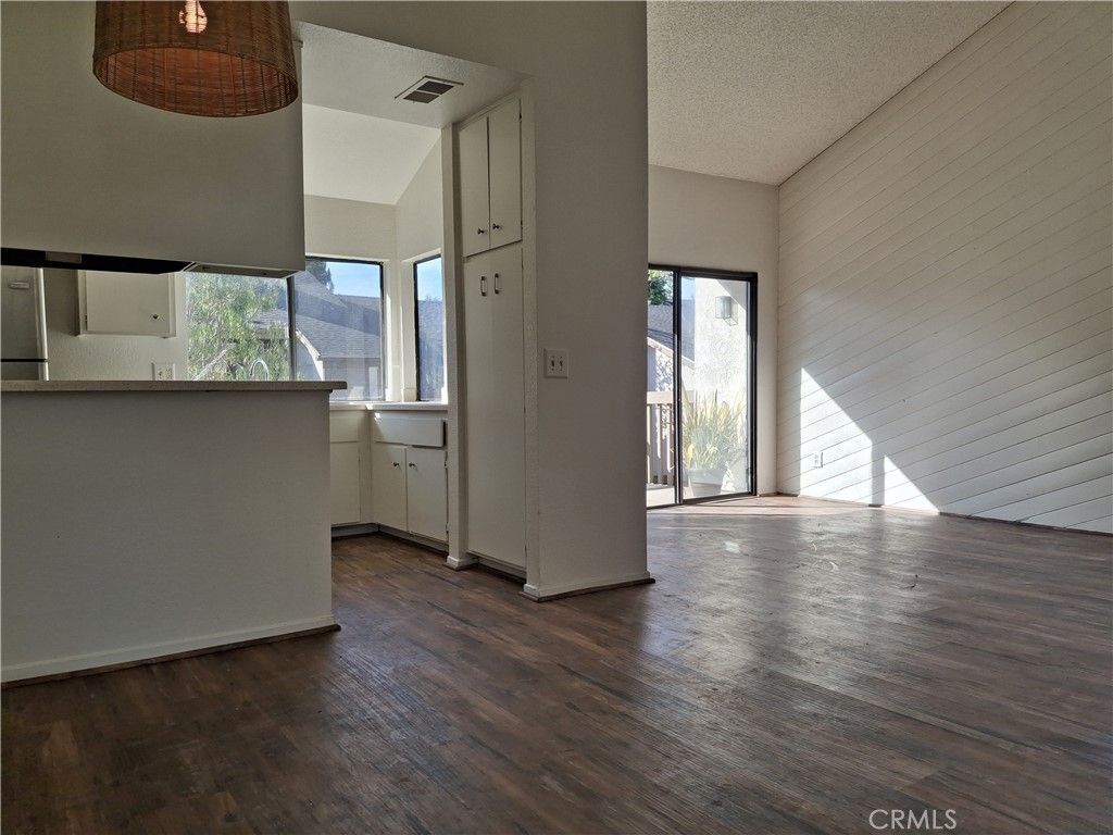 This charming end-unit condo, situated on the upper level, offers a private patio overlooking a tranquil man-made brook and pond, surrounded by lush, mature trees. The light-filled interior features soaring cathedral ceilings, new paint, kitchen and appliances, a cozy living room with direct access to the patio. The dining area includes mirrored accents, and the spacious one-bedroom layout boasts a walk-in closet and in-unit laundry for added convenience. Located in the desirable Quail Creek complex, residents enjoy access to pools, spas, tennis courts, a dog park, scenic streams, ponds, and beautifully maintained greenbelts. The HOA dues cover water, trash, sewer, gas, and insurance; the tenant is only responsible for electricity. The unit includes covered parking (Space #800). Easy access to freeways, restaurants, and shopping makes this a perfect place to call home!