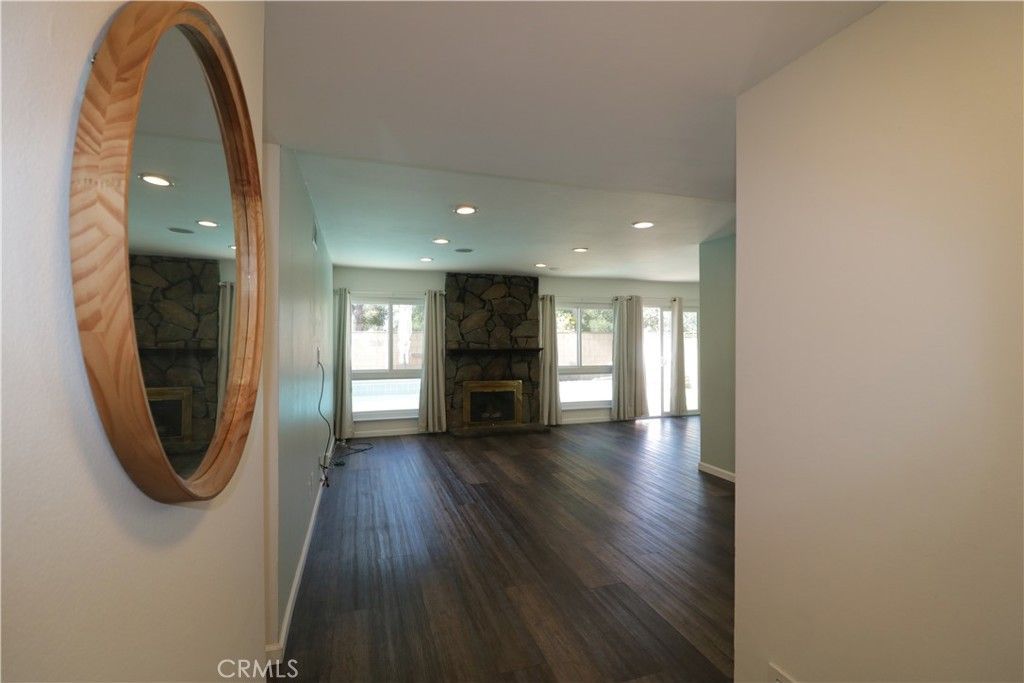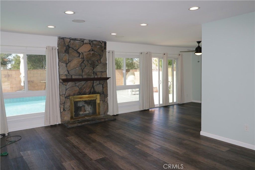 This charming, partially remodeled home is available for a long-term lease in a lovely neighborhood of Canyon Country. The covered front porch leads you into this 3-bedroom, 1.75-bathroom home featuring many upgrades. The inviting open floorplan includes double-paned windows and beautiful laminate floors throughout the home. The remodeled kitchen with a breakfast area offers generous cabinet and counter space. Stainless steel appliances include a refrigerator, gas range, microwave, and dishwasher. The light and bright living and dining area includes a gas-burning fireplace and has direct access to the backyard. The master suite features a walk-in closet and a private bath, while the two additional bedrooms offer generous closet space. Outside, you will find a fully fenced, private backyard with a concrete patio and a heated swimming pool. The property also includes a two-car garage with direct access and an extra-large driveway. Discovery Park is just minutes away and visible from the backyard, with no neighbors living directly behind the property.