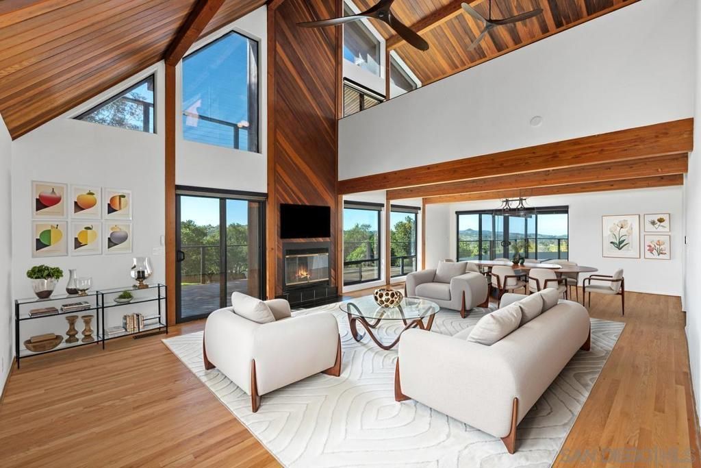 Experience the pinnacle of sophisticated rural living in this custom built western red cedar masterpiece. Set on 2 sprawling acres, this 3 bedrom, 2 bathroom main residence blends timeless craftsmanship with modern luxury. The heart of the home features soaring vaulted wood ceilings and a dramatic fireplace anchoring the great room, while new Milgard windows and slider doors frame breathtaking panoramic views of the valley and hills. The open concept design flows effortlessly to expansive decks, perfect for taking in sweeping vistas under motorized awnings. This versatile estate includes a fully attached 1 bedroom guest house with its own kitchen, living area, and private fenced yard, ideal for multi generational living or rental potential. Modern efficiency is built in with a solar system and a whole house backup generator for ultimate peace of mind. Outdoors, your private sanctuary includes a lush Valencia orange grove, a relaxing hot tub, and a detached workshop for the hobbyist. The property is fully equipped for a refined agricultural lifestyle with a 2 inch agricultural water main, a covered livestock area, and a chicken coop. Practicality meets luxury with a 4 car garage featuring motorized screens, dedicated RV parking with a large vehicle entrance, and a private gated entry. Move in ready and meticulously maintained, this is a rare opportunity to own a piece of North County serenity designed for elegance and effortless indoor outdoor living. This custom red western cedar home represents the finest in Valley Center living, offering a unique blend of architectural excellence and practical utility. The main level is designed for grand scale entertaining, highlighted by a massive great room with floor to ceiling wood accents and premium hardwood flooring. Recently upgraded with new Milgard windows and slider doors throughout, the interior is bathed in natural light while maintaining privacy with custom blackout shades. Exterior motorized window screens and awnings provide effortless climate control and shade for the expansive outdoor living areas. The attached guest house is a complete secondary residence, featuring its own bedroom, bathroom, kitchen, and living area, along with a dedicated fenced yard and deck. Sustainability and self reliance are core features, including a solar system and a whole house backup generator. The home is further enhanced by a whole house water filter and a central vacuum system for modern convenience. For those with agricultural or hobbyist interests, the 2 acre estate offers a producing Valencia orange grove and lemon tree supported by a 2 inch agricultural water main. The property is fully animal ready with a chicken coop, a covered livestock or work area, and a fully fenced dog run. Storage and workspace are abundant with an attached garage plus a detached workshop. The garage doors are equipped with motorized retractable screens, allowing for a breezy workspace. Large vehicles and trailers are easily accom