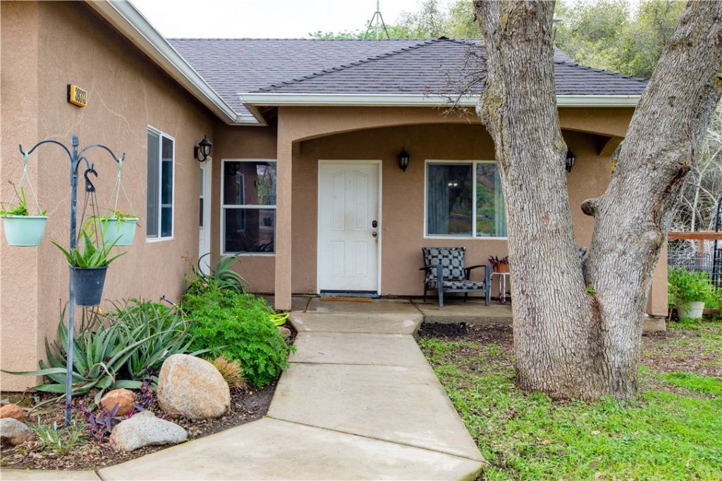 Welcome to this charming 3-bedroom, 2-bathroom home built in 2006, perfectly situated on a 2.3+/- acre corner lot in the heart of Squaw Valley. This property is a nature lover's dream, filled with mature towering oaks, buckeyes, redbuds, and ferns that line a peaceful creek. The exterior is a true retreat featuring a welcoming covered front porch and a spacious back open patio designed to take full advantage of the natural beauty and sound of the creek. The primary bedroom offers its own private access to the back patio, creating a perfect space for morning coffee or evening relaxation. For those looking for the full homestead experience, there is an established chicken coop and plenty of usable space to expand. The interior offers a modern, open-concept layout with tall, vaulted ceilings, LED can lighting, and durable laminate wood flooring. Elegant granite countertops are found throughout the home, and the kitchen is equipped with stainless steel appliances, including a gas stove and dishwasher. The home features a durable stucco exterior and easy access from the main road. Practical utility features include dual-pane windows, steel gutters, a tankless propane water heater, and an energy-efficient HVAC system. The 2-car attached garage offers convenient outside access from both sides. Enjoy the peace and quiet of foothill living while being just minutes from the local Country Store and Dunlap School, while Central Valley shopping & Kings Canyon/Sequoia National Parks are under an hour away. Whether you are looking for a full-time residence or a mountain getaway, this property offers the perfect blend of comfort and natural beauty.