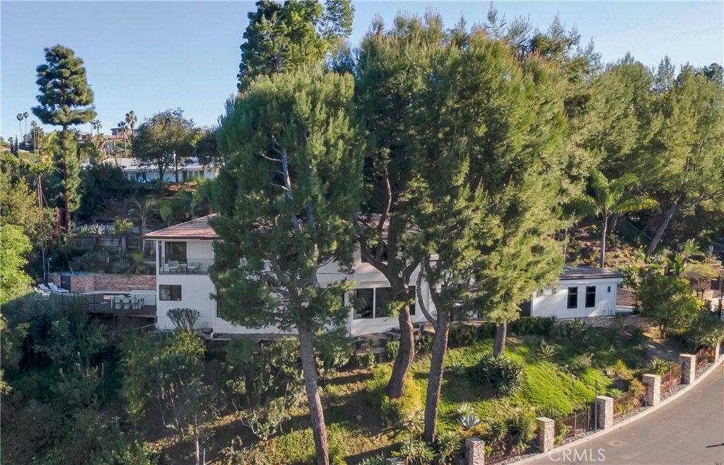 Located on a quiet cul-de-sac in the Encino Hills within the highly sought-after Lanai Road Elementary School district, this beautifully redone gated two-story contemporary residence offers extreme privacy and stunning views from every room. Enter through a security gate to a courtyard with lush greenery and fountains. The first level features a step-down living room and a spacious family room with fireplace and bar, along with a formal dining room enhanced by built-in buffets. The designer kitchen and bathrooms showcase Porcelanosa and Ann Sacks tile, Robern cabinets and backlit mirrors. The kitchen is appointed with bookmatched maple veneer lower cabinetry, white gloss upper cabinets with under-cabinet and floor lighting, quartz countertops with a waterfall edge, and glass-tiled groutless backsplash. A full suite of Miele appliances includes a refrigerator/freezer, convection oven, 5-burner range, hood, and warming drawer, along with a hot and filtered water dispenser and Rohl faucet. A breakfast nook with a built-in table and bench seating provides an inviting dining space. Hardwood and tile floors run throughout. A downstairs bedroom with a ¾ bath completes the main level. Upstairs are three bedrooms, including the luxurious primary suite featuring a fireplace, balcony, and an expansive walk-in closet with island. The spa-inspired primary bath offers an oversized shower with multiple shower heads and bench seating, plus a chromatherapy soaking tub. An upstairs laundry room adds convenience. The lushly landscaped grounds include stacked stone accents, colorful succulents, a lap pool and spa with Pebble Tec plaster, a dramatic five-level waterfall, a large Trex deck, and a barbecue area?perfect for entertaining. Additional highlights include custom lighting throughout, Fleetwood windows and doors, new glass garage doors, a newer roof, and an enclosed coyote-safe area for pets.
