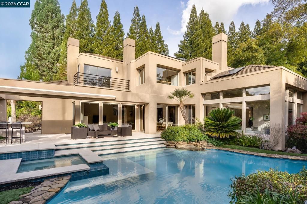 Sophisticated custom contemporary in a prestigious gated Blackhawk community. Privately situated on approximately 0.40 acres, this architectural showpiece blends modern design with seamless indoor-outdoor living. New European French oak floors, dramatic beams, a sculptural floating staircase, floor-to-ceiling windows, and a free-form pool create a striking yet warm aesthetic. The main level boasts a dramatic entry, spacious formal living room with a stunning two-sided fireplace, and a large chefs kitchen featuring custom cabinetry, an elliptical island, and stainless steel appliances. The kitchen opens to the family room with a custom theater system. A full bath with direct pool access and a bedroom with an additional full bath complete the main level. Upstairs, the primary retreat offers a fireplace and adjacent flex/office space. Two additional bedrooms and a hall bath provide comfortable accommodations. Resort-inspired grounds include a pool and spa, outdoor shower, built-in BBQ, putting green, vegetable garden, fruit trees, and mature landscaping. Solar, new HVAC, integrated home theater, EV charging station, built-in speakers, and a 3-car garage complete this exceptional modern residence. MORE PHOTOS TO COME.