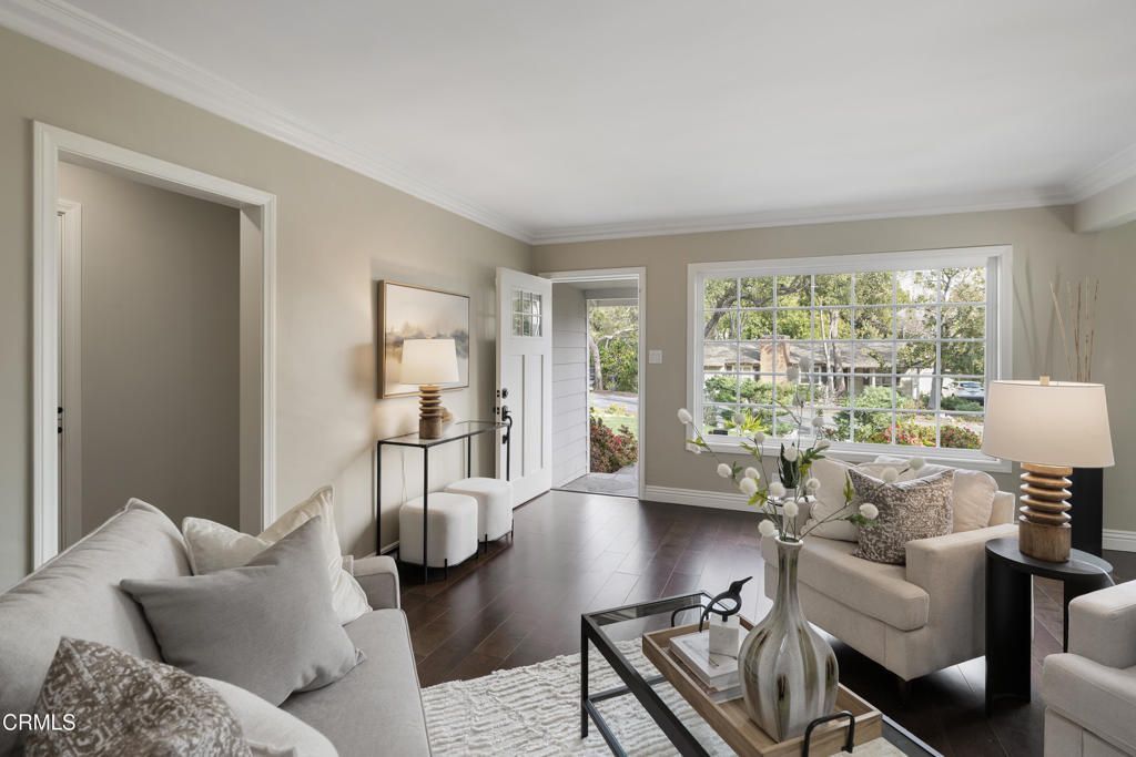 Ideally located in the sought-after foothills of La Canada Flintridge, this charming corner-lot home combines timeless appeal with thoughtful updates. Impeccable curb appeal welcomes you with manicured landscaping, a mature shade tree complete with a classic rope swing & a winding flagstone pathway leading to the covered front porch. Inside, hardwood flooring & crown molding set a warm tone in the light-filled living room. A corner gas fireplace with an oversized mantel anchors the space, while recessed lighting & a large picture window overlook the lush front yard. The open layout flows into the dining room, highlighted by another expansive window & a stylish designer chandelier, perfect for gatherings both intimate & grand. The remodeled kitchen is a true centerpiece, featuring stone countertops, a custom-tiled backsplash, recessed lighting, crown molding & a premium stainless Viking Professional appliance suite, including a six-burner range & oven, range hood, refrigerator, freezer & dishwasher. The kitchen opens seamlessly to a spacious family room with recessed lighting & crown molding, creating an ideal setting for everyday living & entertaining. Direct access to the attached two-car garage & additional storage enhances convenience. The bedroom wing offers comfort & privacy. Two secondary bedrooms feature hardwood floors, crown molding, dual-pane windows & mirrored closet doors. A full hallway bathroom includes a deep soaking tub & shower combination, an oversized stone-topped vanity & elegant finishes. A whole-house fan provides added efficiency. A dedicated laundry area with a side-by-side washer & dryer is tucked behind louvered doors. A versatile third bedroom, currently used as an office, offers generous closet space & a sliding door leading to the backyard. At the rear of the home, the primary suite serves as a serene retreat with crown molding, a ceiling fan & French doors opening to the patio. The ensuite bath is beautifully updated with basket-weave tile flooring, a dual-sink stone vanity, recessed lighting & a custom glass-enclosed shower with bench seating & tile extending to the ceiling. Outdoors, the backyard is designed for both relaxation & entertaining, featuring a pergola-covered patio with a built-in barbecue island, a grassy yard & raised garden beds. Located in a wonderful neighborhood close to excellent schools, local dining, & shopping, this La Canada home offers comfort, quality, and lifestyle in one exceptional setting.