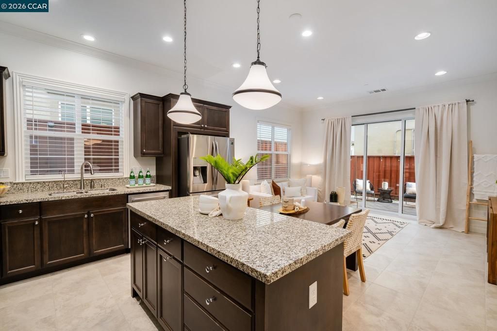 Beautifully appointed 4 bed, 2 full & 2 half baths home in the highly desirable Gale Ranch community of San Ramon! Offering 2,171 square feet of thoughtfully designed living space, this light-filled residence blends comfort, style, & functionality. The open main level features a stunning chefs kitchen with rich dark cabinetry, granite countertops, stainless steel appliances, gas cooktop, double ovens, & a generous center island with bar seating, perfect for casual dining & entertaining. The kitchen flows seamlessly into the dining & living areas, creating an inviting space for gatherings of all sizes. Large windows, recessed lighting, & neutral finishes enhance the bright & airy feel throughout. Upstairs, a versatile loft provides additional flexible living space or home office. The loft opens directly to a covered patio, creating a seamless indoor-outdoor extension. The spacious primary suite serves as a private retreat, complete with a spa-inspired bathroom featuring dual vanities, a soaking tub, & a separate glass-enclosed shower. Additional bedrooms are generously sized & well-suited for family, guests, or work-from-home needs. Ideally located near top-rated schools, parks, trails, shopping, & dining, this home offers exceptional style, comfort, & convenience.