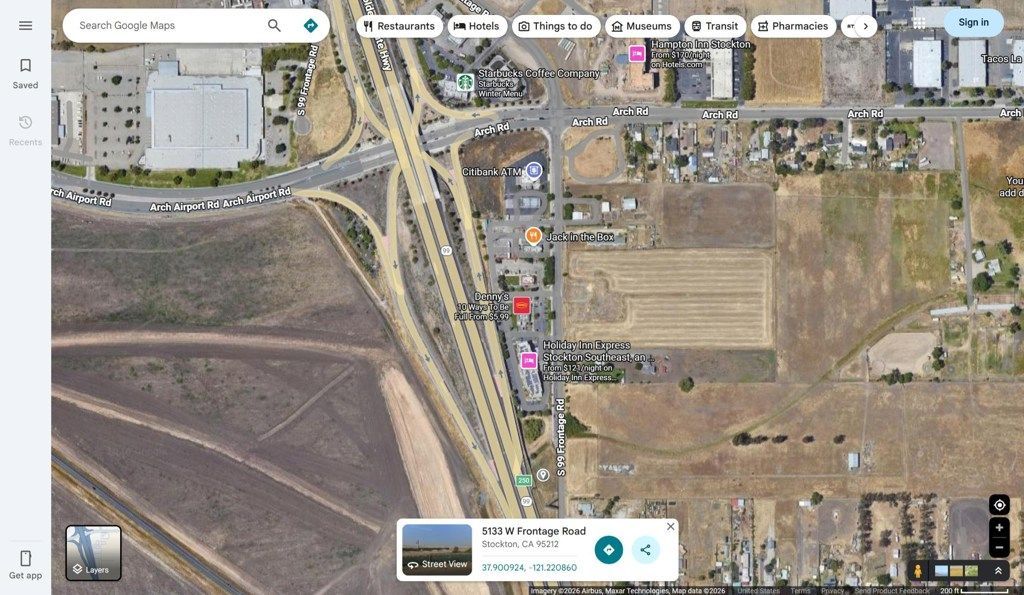 Prime vacant commercial land with excellent visibility and frontage along State Route 99 West Frontage Road in South Stockton. This approximately 0.62-acre parcel offers outstanding exposure to high daily traffic counts and convenient access to the Arch Road interchange. Ideal for a variety of commercial uses, including retail, restaurant, service station, office, or highway-oriented development. The strategic location near major distribution centers, residential neighborhoods, and regional transportation routes makes this an excellent opportunity for both owner-users and investors seeking long-term growth. Billboard is not included in the sale.