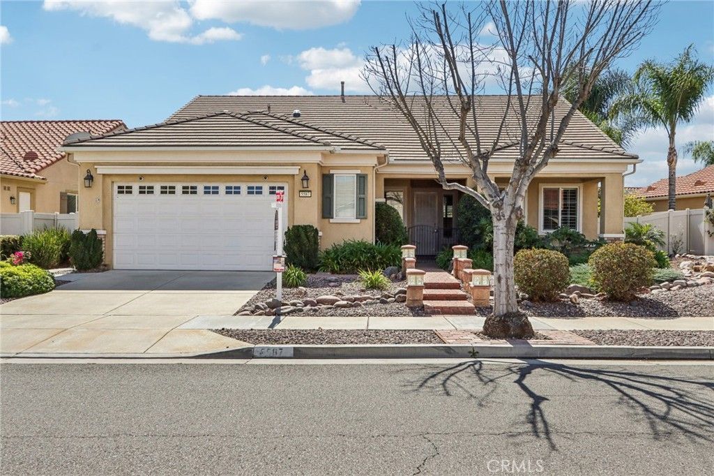 Welcome to Resort-Style Living in the 55+ Community of Solera Diamond Valley by Del Webb! This beautifully upgraded 55+ residence combines thoughtful design with comfort and convenience, offering a one-of-a-kind opportunity in Hemets premier active adult community. From the moment you arrive, youll notice the care and attention poured into every detail. Step inside to find elegant crown molding, plantation shutters, and custom cabinetry throughout the living room, office, craft room, laundry, and master bath. The tiled living room floor with carpet overlay gives you the flexibility of enjoying both tile and carpet. The kitchen is a true chefs delight, featuring under-cabinet lighting, and a water filtration system. The air-conditioned garage offers exceptional functionality with a built-in workbench, storage racks, and generous space for a second refrigerator and freezer. Outside, youll love the xeriscape front yard with river rock, rain gutters, and a welcoming front gate and patio. The backyard is a private retreat, complete with a little fish hole, flagstone paving, bullnose edging, and drip irrigation for effortless maintenance. A dog door adds convenience for pet lovers, while the outdoor storage shed provides extra space for tools and hobbies. Comfort and peace of mind are built in with steel security screen doors, an all-house fan, and a comprehensive exterior surveillance system featuring eight cameras with night vision, motion detection, infrared augmentation, and a large monitor with two-week memory storage. In the master bathroom, youll appreciate the step-in shower and thoughtfully placed grab bars for ease and safety. Custom under-cabinet lighting in both the kitchen and office adds style and function. This is not just a home?its a lifestyle. Solera Diamond Valley offers resort-style amenities, including a clubhouse, pools, fitness center, walking trails, and a vibrant calendar of community events. Come see why this home stands out from the rest?schedule your private tour today!