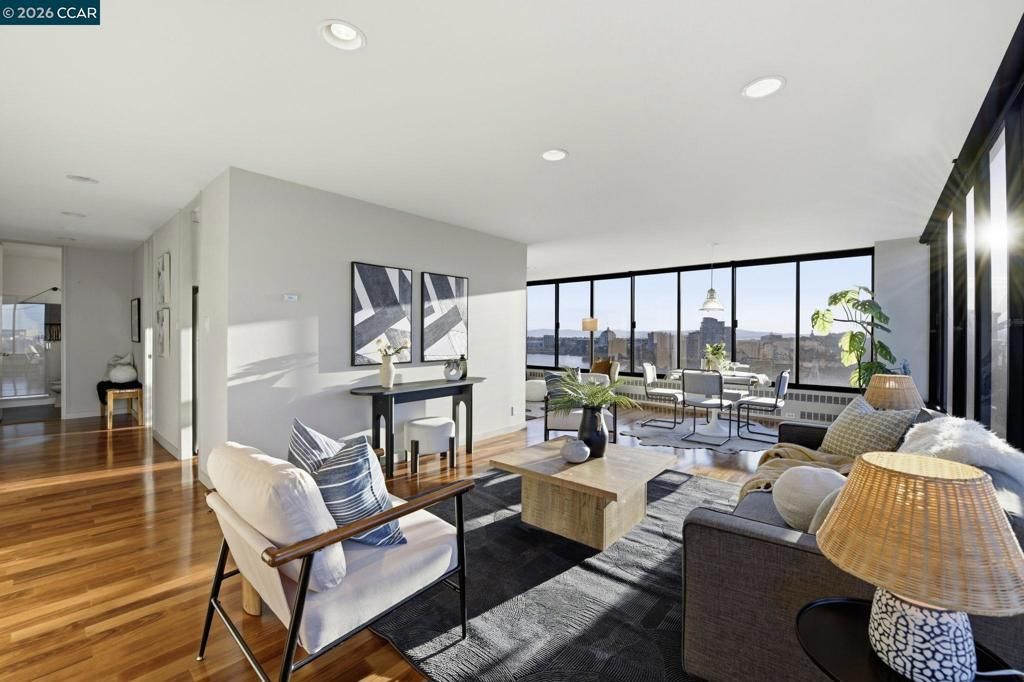 Spectacular corner-unit. Enjoy the sparkling views of Lake Merrit, as well as sights of sophisticated city lights from your private perch. Located in one of Oakland's most desirable Luxury buildings. Floor to ceiling windows from every angle. Primary bedroom includes wood floors throughout, custom remote-control sunshades and built in closets with soft close drawers. What else can you ask for? Choose to be among clouds, while enjoying city life. A stone's throw from restaurants, transportation and the Oakland's Saturday Farmers Market. Amenities include full gym, covered pool, sauna, front door security, underground parking, and unmatched access to walking trails and picnic areas around Lake Merrit. Minutes from freeways and BART. Views: Downtown