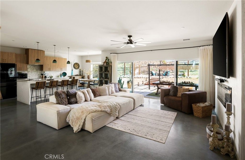 Modern living meets rural desert luxury on the Yucca Mesa, where higher elevation brings cooler summers and occasional snowfall in the winter. This newly built 2024 home features three en-suite bedrooms plus a separate powder room, high-end finishes throughout including a river rock stone sink, micro cement walls, polished concrete floors, ceramic and quartz counters, and custom light fixtures, with expansive windows and sliders framing 360° views from the Joshua Tree National Park ridgeline to the snow-capped peaks of San Jacinto and Big Bear. A long driveway sets a striking approach and guides you past the horse stables before arriving at the front gated courtyard, wrapped by a smooth stucco wall and landscaped with beautiful cacti and desert plants, centered around a built-in fire pit for sunset skies. The fenced backyard captures sunrise views, also framed by dramatic mountain backdrops. Inside, custom-designed storage cabinets run from the entry through the hallway, complemented by vertical glass panes that bring in views and soft, indirect lighting. The open-concept living, dining, and kitchen space is anchored by a large kitchen island, creating an easy flow for cooking, entertaining, and relaxing, while large sliders connect the living area to a covered patio for seamless indoor-outdoor living. The kitchen is finished with quartz counters, stainless appliances, a 36 range, and a large walk-in pantry; a conveniently located laundry room sits just off the kitchen and leads to a large attached two-car garage with additional window panels that bring in natural light. The primary suite offers a walk-in closet, private water closet, and a spa-style bath with double sinks, a separate shower, and a soaking tub positioned by a beautiful window with views. Just a few minutes from downtown Joshua Tree and the park entrance, with easy access to Pioneertown and downtown Yucca Valley, this home is ideal as a primary residence, vacation home, or short-term rental opportunity.