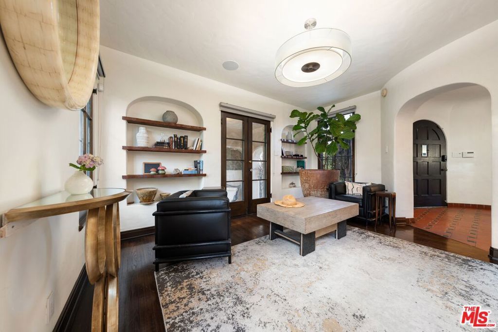 A rare opportunity to own a piece of Los Angeles history, this Spanish Revival residence in Hancock Park was originally designed by noted architect Donald Uhl. Blending timeless 1920s character with modern upgrades, the home has been reimagined to meet today's lifestyle while honoring its architectural roots. Step through the arched entryway and be greeted by original tile floors and a sweeping wrought-iron staircase, setting the tone for the craftsmanship found throughout. Natural light fills the formal dining room, which opens to a private courtyard featuring an outdoor fireplace and fountain, perfect for intimate gatherings. The gourmet kitchen is equipped with top-tier Miele appliances, including a wine fridge, steam combi oven, and built-in coffee system, making it both functional and stylish. A versatile den or office sits just off the entry, offering flexibility for work or relaxation. Upstairs, three spacious ensuite bedrooms provide comfort and privacy. The primary suite includes access to a private balcony, extending the living space outdoors. The grounds are beautifully landscaped with mature plantings, including camellias, coral trees, palms, and roses, all enhanced by thoughtfully designed exterior lighting. With a full home sound system, Wi-Fi integration, security, and CCTV, this residence seamlessly merges historic charm with the conveniences of contemporary living.