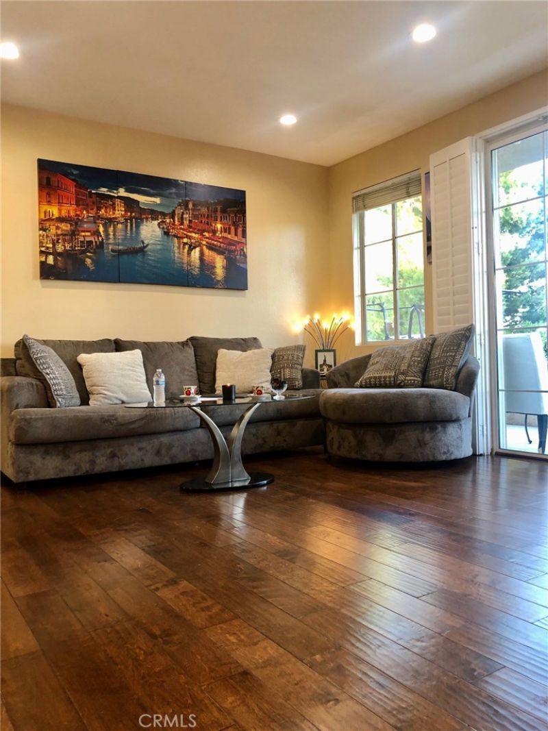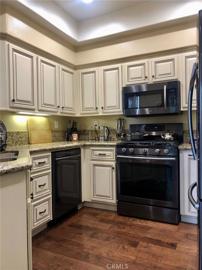 Desirable Ground-Floor 2-Bedroom Condo in Gated Viewpointe North. Beautifully updated ground-floor two-bedroom, two-bathroom condo located in the highly sought-after gated community of Viewpointe North. This popular floor plan offers no interior steps and a spacious private patio extending from the living room to the primary bedroom ? ideal for indoor-outdoor living. The inviting living room features wood-laminate flooring, a remodeled fireplace, recessed lighting, plantation shutters, and a sliding glass door providing direct patio access. The remodeled kitchen showcases granite countertops, custom cabinetry, recessed lighting, stainless steel appliances, updated sink and faucet, and includes a stainless steel refrigerator. The primary suite offers wood-laminate flooring, sliding glass door to the patio, a beautifully remodeled bathroom with dual-sink vanity and walk-in shower, plus a generous walk-in closet. The sizable guest bedroom is complemented by an updated guest bathroom with bathtub/shower combination. Additional features include a convenient indoor laundry closet suitable for a full-size washer and dryer, an attached one-car garage with direct access, and an additional covered carport nearby. Viewpointe North residents enjoy resort-style amenities including two pools, spas, and a clubhouse, all within a gated setting. Ideally located within walking distance to hiking and biking trails, parks, and award-winning Anaheim Hills Elementary.