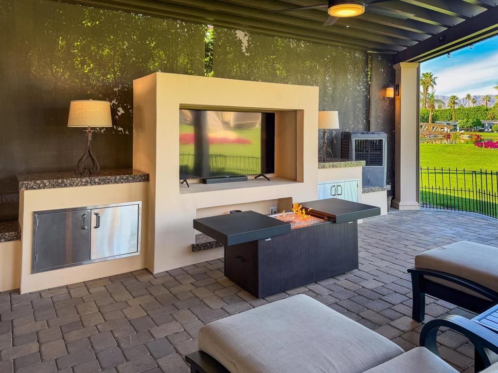Welcome to Lot 294 at Outdoor Resort Indio, a beautifully upgraded entertainer's lot with stunning mountain, lake, waterfall, bridge, and golf course views.The spacious L-shaped pergola features an insulated solid roof, six radiant heaters, and four ceiling fans, with six electric screens to fully enclose the back and additional screens surrounding the kitchen area. An outdoor entertainment center with a large TV, protective rolling door, and fireplace readiness creates the perfect gathering space.The oversized kitchen showcases granite countertops, a built-in Traeger smoker, four-burner cooktop, oven, dishwasher, under-counter refrigerator, full-size refrigerator, and extensive custom storage. Pavers surround the lot, complemented by a six-year-old concrete RV pad, mid-lot water and sewer hookups, and two sewer connections.Offered furnished, the lot includes a large dining table for eight, a comfortable seating area with fire table, bar stools, storage cabinets, cantilever umbrella, and dog fencing. There is also room for a full-size truck and golf cart.Walking distance to the clubhouse, yet far enough away to maintain your privacy.Outdoor Resort Indio is a Class A RV only resort.