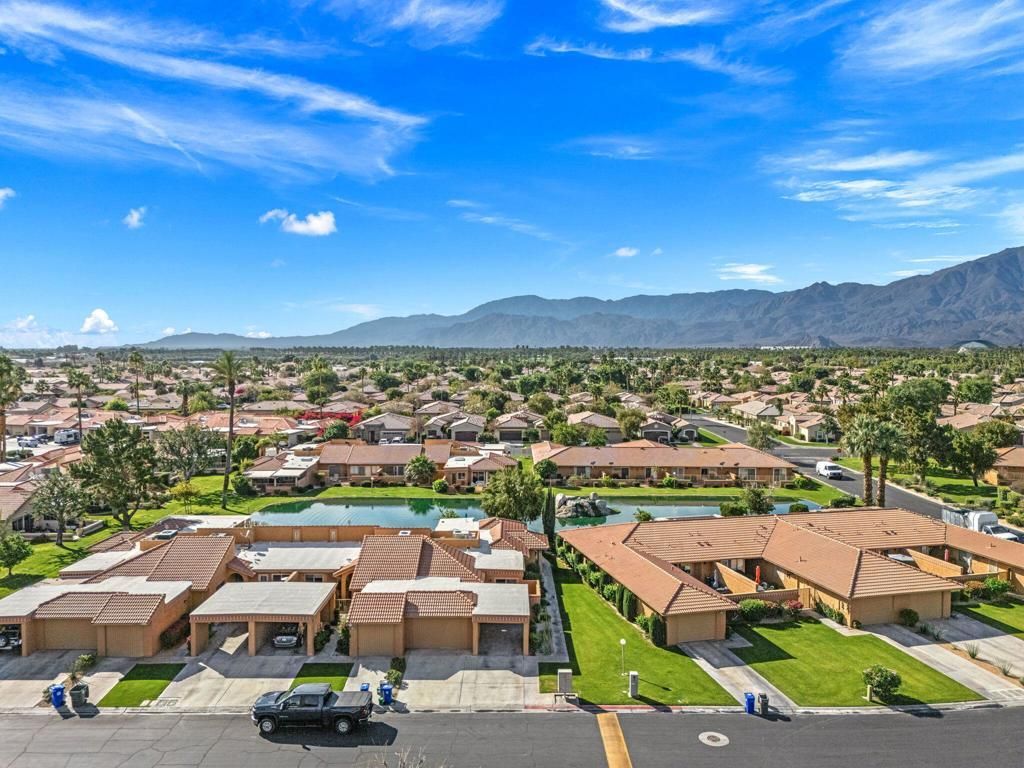 Indian Palms CC - Here is a light and bright like new and recently redone condo with 2 bedrooms, 2 baths, 1 car garage and carport with gorgeous lake and panoramic mountain views in a quiet location. You will love the updated kitchen with white cabinets and stainless appliances plus separate dining area with a wet bar. The living room is spacious with lake views. Both bedrooms are large and have ensuite baths plus they open on to a back private patio. The backyard patio has incredible lake and mountain views with a gas BBQ and plenty of space for dining and lounging in the warm sun. The condo has recently been repainted inside and out. The floor are plank tiles that looks like wood. There a community pool a few short steps away from the home. Indian Palms CC has pay as you play golf, plus a low monthly fee for tennis, pickleball, community pools, fitness, manned gate, and a restaurant plus it is near shopping, restaurants and medical. This is a perfect primary home, vacation home, or investment property. The home is being offered turnkey furnished so you can bring your clothes and start playing golf and tennis right away!