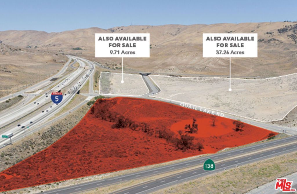 We are pleased to present a unique opportunity consisting of 13.21 acres on primarily flat commercial land along the 5 Freeway at the intersection of Highway 138. With 3 freeway off-ramps/on-ramps directly onto the property, the property, which has already paved roads, is well-positioned for a developer to take advantage of the 250,000+ vehicles per day traveling along one of the busiest freeways in the world that provides access to Los Angeles ports, Central Valley agricultural businesses, San Francisco tech hubs, and the entire West Coast. Ownership has a land use survey completed by David Evans and Associates, Inc. which can be made available for qualified buyers. Potential uses include hotels/motels, drive-through services, utility-scale solar energy, along with a myriad of other options, which the Buyer shall rely on their own due diligence and investigations to confirm in full. With nearby future developments including the fully entitled 12,000+ acre Centennial at Tejon Ranch Master Planned Community approximately3 miles away, which include 19,000+ homes and 10M+ square feet of retail/public/business park/office space/civic development, the next owner of these parcels may be well positioned for significant growth over the coming years. Also nearby is Pyramid Lake only 5 miles to the south, and the Tejon Ranch Commerce Center just 8 miles to the north. Seller financing available for qualified buyers! Contact the listing team today for additional information regarding this unique opportunity.
