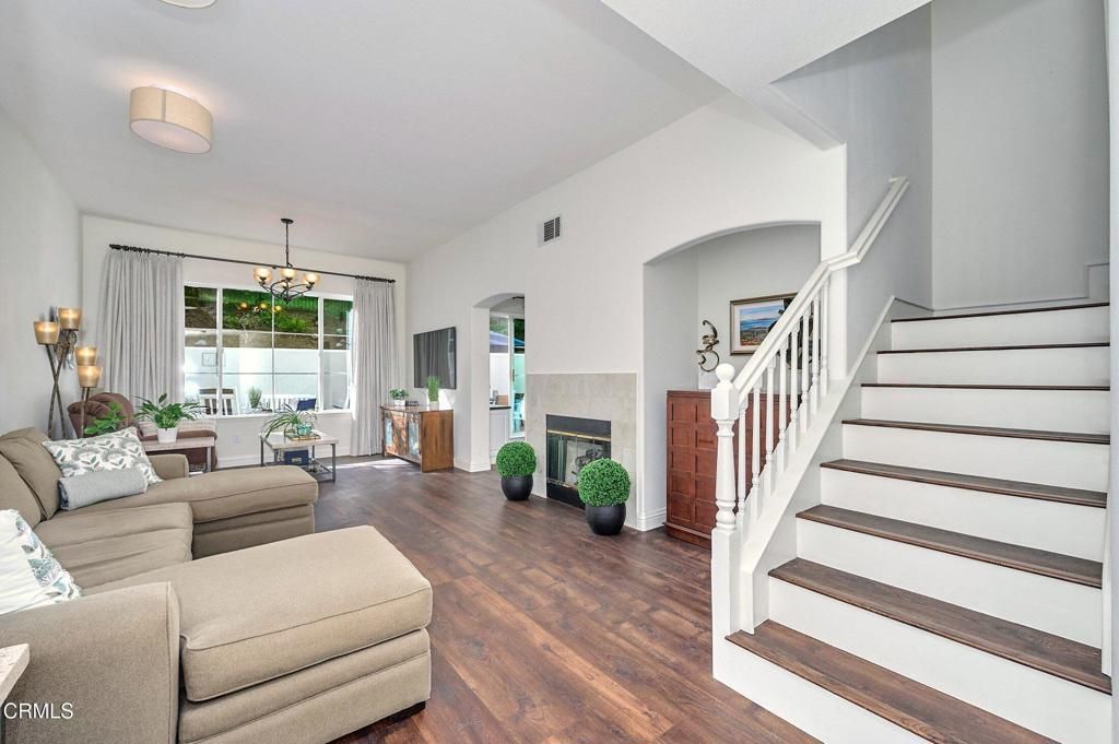 Set along the fairways of the prestigious Spanish Hills Golf Course, this impeccably maintained residence offers privacy, elegance, and scenic surroundings. The primary suite enjoys captivating views of city lights, mature neighborhood trees, and rolling valleys, creating a tranquil and elevated retreat.Presented in great condition, the home features wood flooring installed throughout, complemented by fresh interior paint, designer lighting upgrades throughout the interior and exterior, and refined finishes. The spacious kitchen includes a well-appointed dining area with custom built-in cabinetry, ideal for both everyday living and entertaining.Additional enhancements include new automatic blinds and drapery in soft, natural tones, updated bathroom mirrors, and thoughtfully selected hardware details. The private backyard oasis is complete with a newly installed fire pit, offering the perfect setting for relaxing evenings in a serene golf-course environment.With its thoughtful upgrades, functional two-story layout, and premier location, this home delivers a move-in-ready, resort-style lifestyle in one of Camarillo's most exclusive communities.